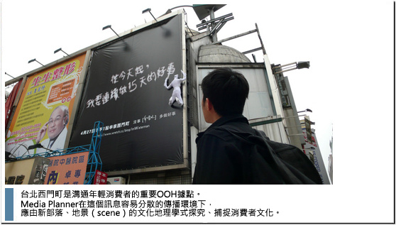 在這個訊息容易分散的傳播環境下,愈了解消費者,就必須找出有別傳統媒體的方法「主動」接觸消費者,於是我們在台北西門町看到這樣一個「多喝水」的OOH版位(見下圖);「多喝水」不只透過奧美廣告在品牌定位、廣告創意、訊息策略上針對消費者文化而定位,在媒體策略上也進一步由新部落、地景(scene)的文化地理學式探究,捕捉消費者文化如何與其它社會形構相互滲透的關係,將媒體策略追隨目標消費者的暫時性及流動性特質,以及可能的新次文化政治。