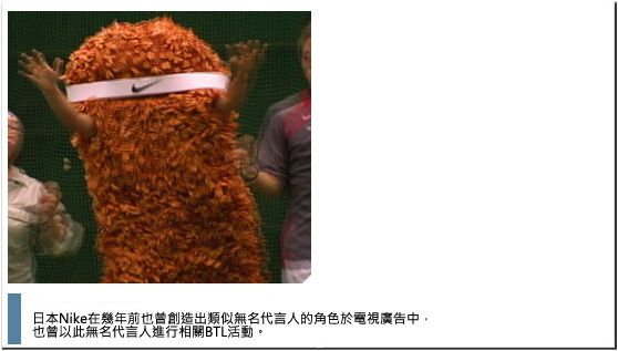 除了「廣告」之外,還有什麼可以接觸到消費者?在這個包裝水市場開始出現廣告投資量的季節環境下,「多喝水」除投入電視廣告的投資外,更加重了在IMC上的輔助,以agenda、partnership、placement等BTL activities的方式「主動吸引」目標消費者的眼光,除了延續一貫的品牌調性外,更創造出「Waterman」的代言人角色,雖然類似這種以品牌核心資產及產品訴求概念為廣告主軸,透過無名代言人展演溝通訊息的手法,前幾年日本Nike也玩過了耶(見下圖;影片請點選連結)。