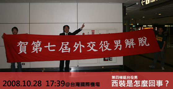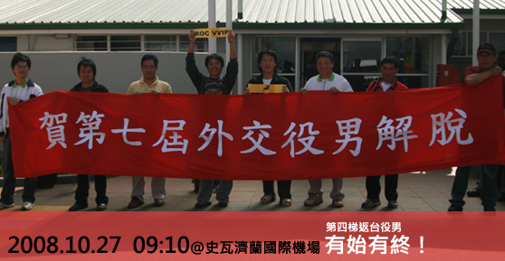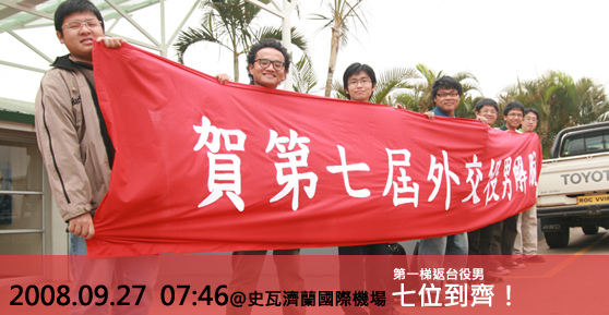 截至民國九十七年為止,所有中華民國的男人皆還是具有服兵役的義務,而目前的役期是「一年」,常備役體位申請服專長替代役則需多兩個月;正常的情況下,每個男人都會折抵軍訓以趕快回歸老百姓的身分,但有沒有不想折抵軍訓、扎扎實實地服完役期的八卦?有,實際的case就發生在外交替代役男上,為什麼要那麼扎實?因為生活快樂而拿的錢也多,多待在國外一個月應該都比回來景氣極差的台灣來得好,即使是第三世界;正因如此,第七屆駐史瓦濟蘭外交役男從今年九月底開始分四梯次陸續退伍,直到十月底,最後一名役男返國,第七屆役男的任務就此正式結束。(退伍回台灣硬是又搞了噱頭,詳見文末)