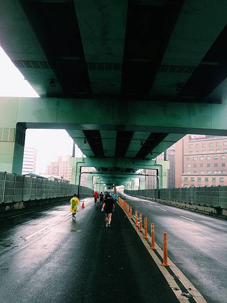 七點,雨還是沒停,開跑了。雨一直打、風一直吹,身體好像一直沒發熱,在新生高架橋前、半馬與全馬的分道處,我遠望著左轉右轉的標誌牌跑著、猶豫著,「要彎去半馬嗎?」直覺還是讓我右轉了,這是第一次我覺得,是我的心帶著我跑。接著沒多久,有人在我後面罵「幹」,我以為我擋住人了,趕緊轉頭說對不起,但看到一個老先生和我點頭,單手扶著他年輕的兒子,他們超越我幾步,兒子持續大聲罵了好多「幹」,我好像看見「文生去看海」裡的文生,而陪跑的親情又讓人想到「派特的幸福劇本」,眼睛盯著他們父子前進,直到消失在人群裡。