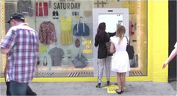 以往櫥窗只供作展示,如能兼具電子商務是否更具效益?紐約街頭的電子櫥窗,即實現了展示與購物的雙重功能;除了以主題吸引特定族群的消費者外,更透過更具效率的物流配送方式,讓Window Shopping不再只是過過乾癮,更可以有效地激起消費者的購買慾並無間斷地引導購買。